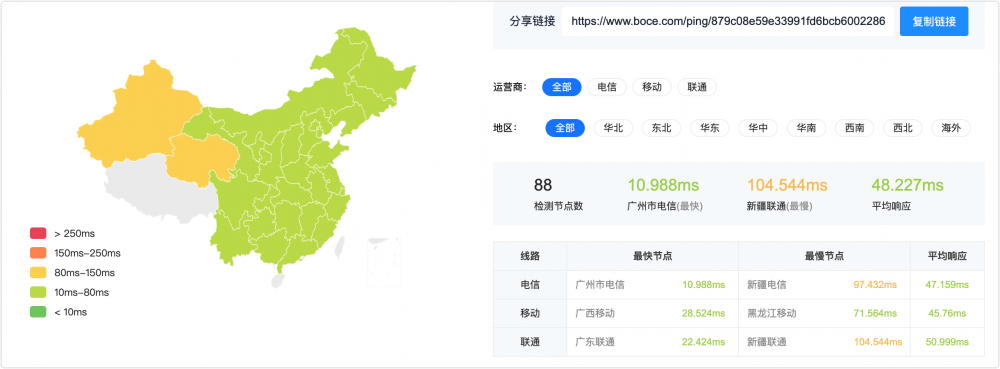 使用撥測對國內延遲進行了測試,國內平均延遲在48ms左右,在香港服務器中,已經算很不錯的了。