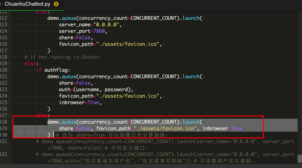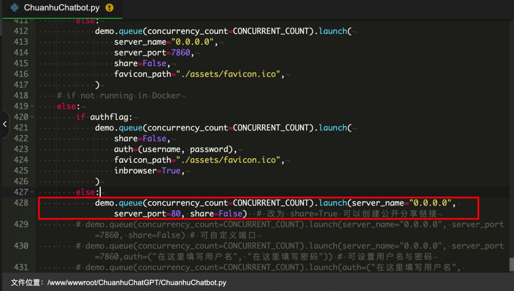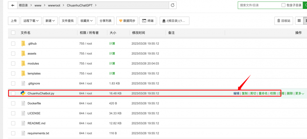 6、等待依賴下載完成后,關閉終端,刷新一下頁面,就可以看到多了一個ChuanhuChatGPT這個文件夾,我們點進去,然后找到如下圖所示的ChuanhuChatbot.py,點擊編輯