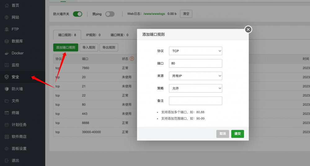 10、點擊安全,然后點擊添加端口規則,將端口輸入80,然后提交