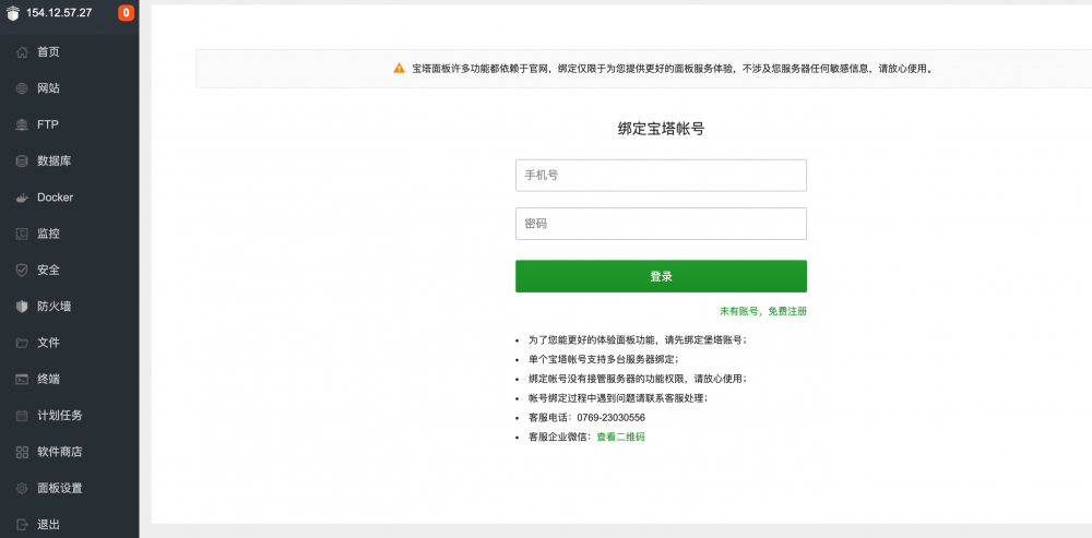 3、在這里輸入你在寶塔官方注冊的賬號密碼(不是剛剛設置的那個),如果沒有的話,點擊一下免費注冊,先注冊一個再登錄