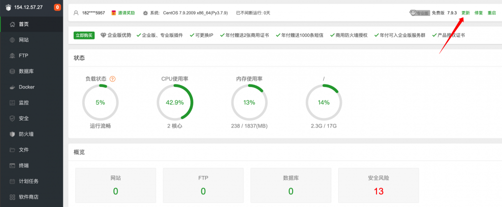 4、點擊右上角的更新,把寶塔版本更新到最新版本