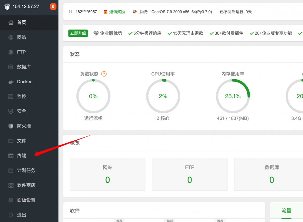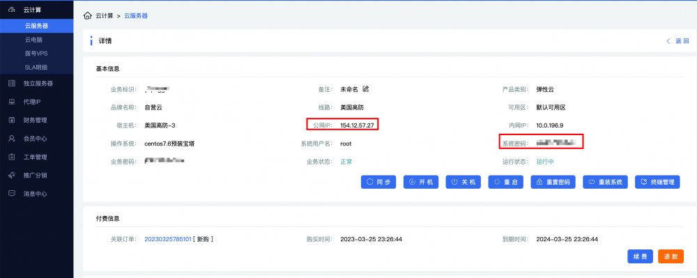 購買完成后,進入服務器管理面板,里面有公網IP、系統密碼,這兩個是我們需要用到的。