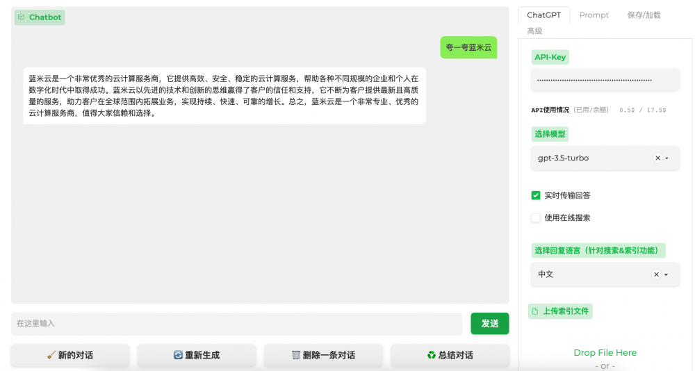 到這里,ChatGPT網站搭建就完成了,現在你可以直接通過瀏覽器輸入http://你的服務器公網IP ,即可訪問并使用了,附一個實際使用的圖: