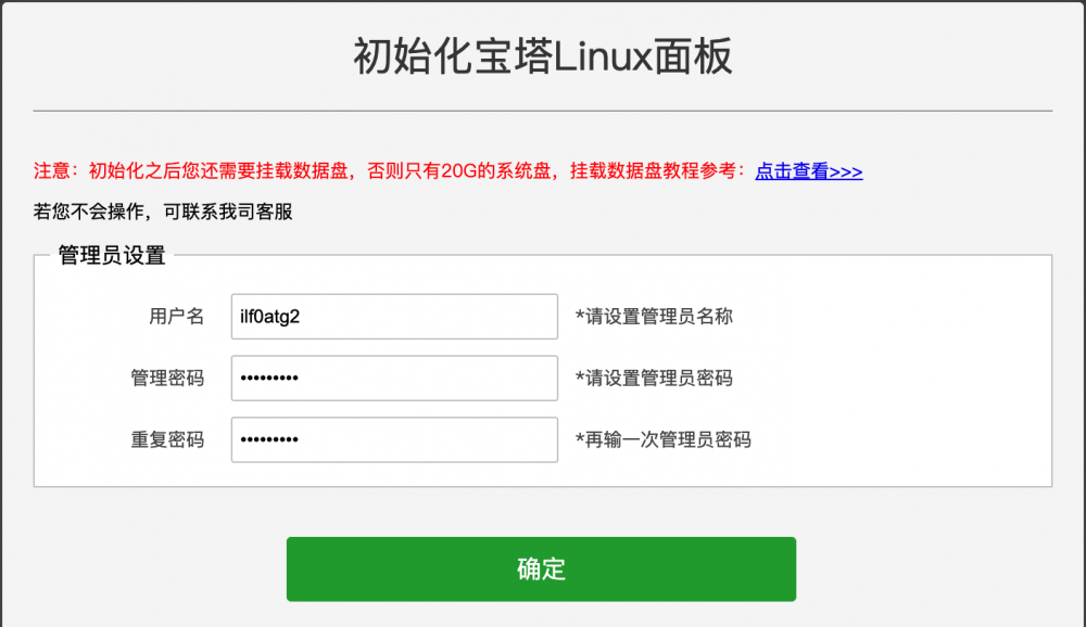 訪問后會出現如圖所示的頁面,請在頁面中設置你的寶塔登錄信息,必須把這個用戶名密碼記住,不然以后無法登錄寶塔