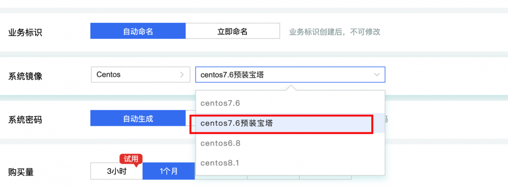 如上圖所示,選擇好規格,然后滑到最底部,選擇系統鏡像為centos7.6預裝寶塔,其他所有配置項都默認即可。