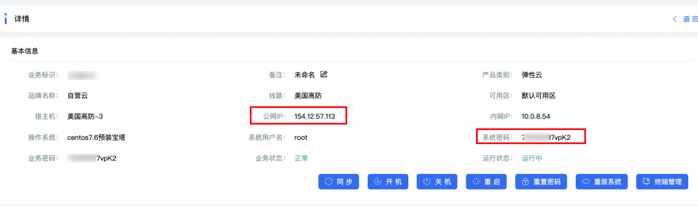 購買完成后,進入控制臺-云計算-云服務器,點擊右側的管理,就可以看到服務器的詳細信息,這里面我們只需要知道 服務器公網IP、系統密碼。