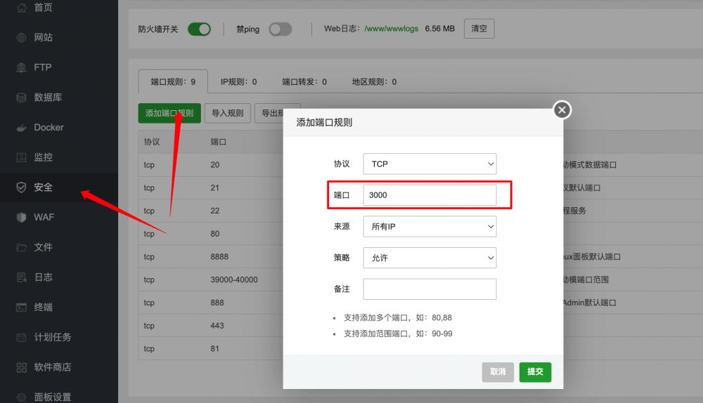 更新完成后,還需要做一件事就是放行端口,這里我們點擊寶塔面板左側的安全,點擊添加端口規則,添加3000端口后,提交即可