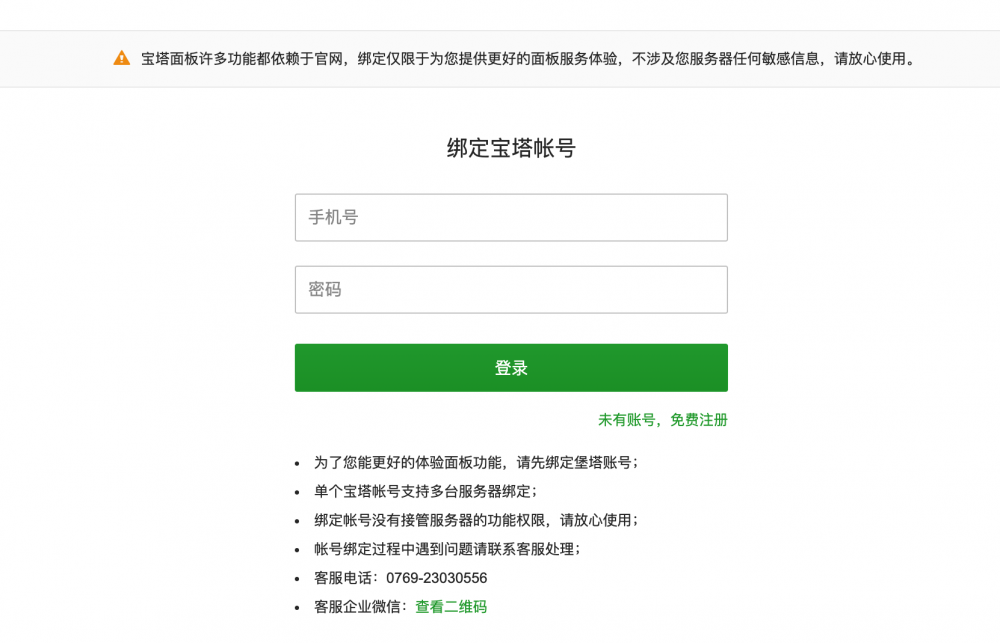 這里的寶塔賬號不是剛剛設置的,而是寶塔官方的登錄賬號,如果沒有的話,點擊免費注冊,先注冊一個賬號,再進行綁定登錄。