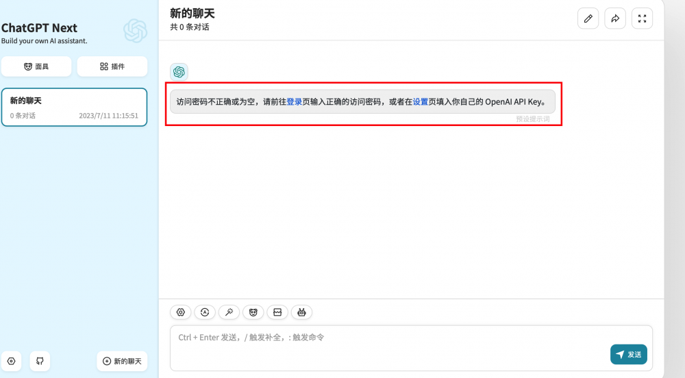 所以剛剛運行命令中的訪問密碼,作用也就是在這里了,當訪問時,如果訪客知道訪問密碼,可以點擊登錄,輸入訪客密碼,就能正常進行問答了。如果不知道訪問密碼,他就必須要點擊設置,輸入自己的openai-key才能正常使用