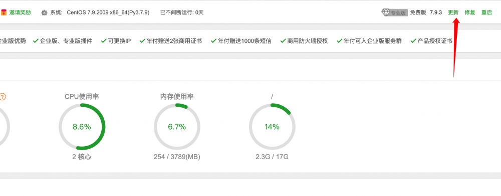 登錄完成后,點擊寶塔面板右上角的更新,將寶塔更新為最新版本,這一步也必須要操作,不然寶塔版本太低可能會出現其他報錯